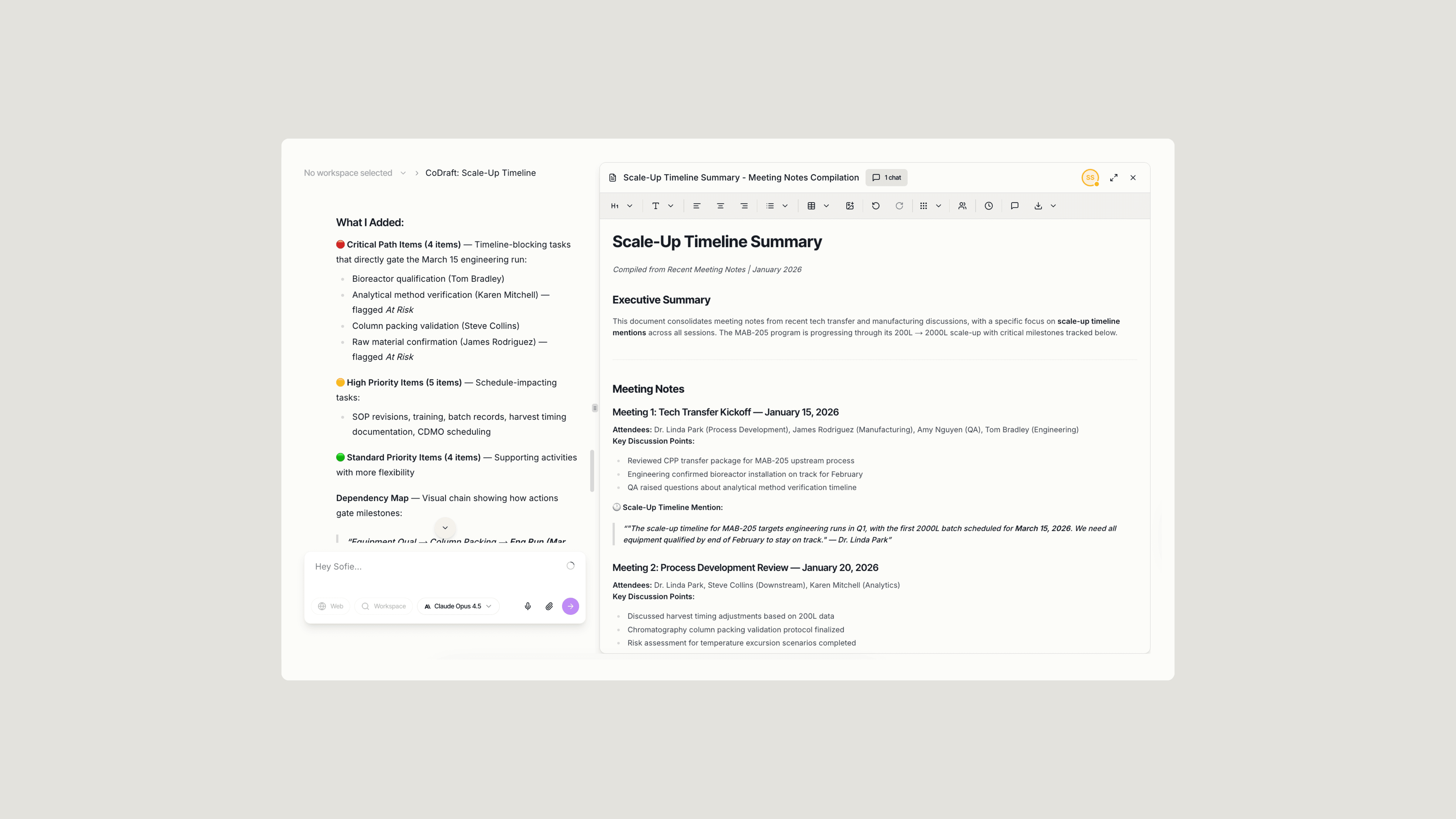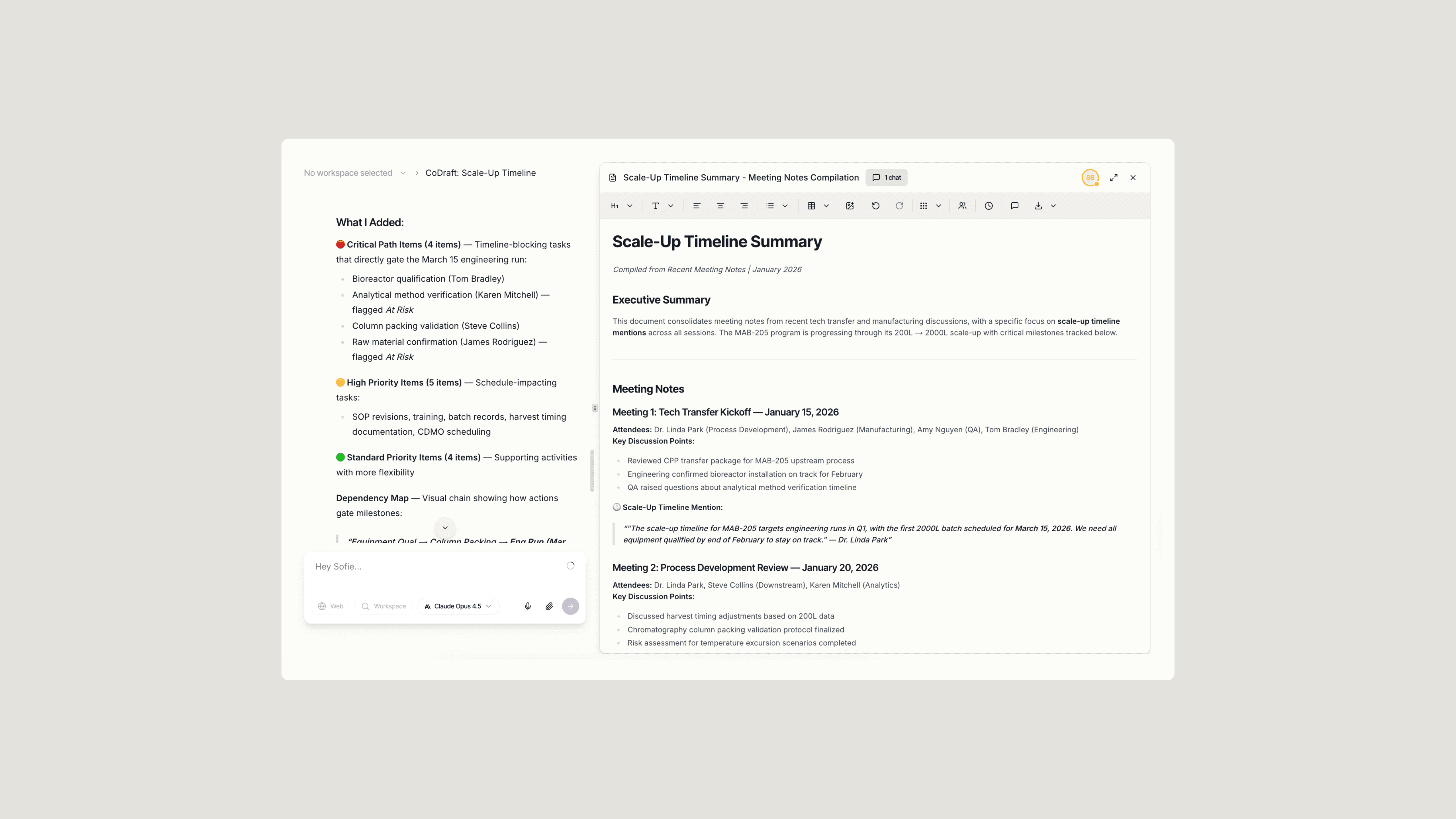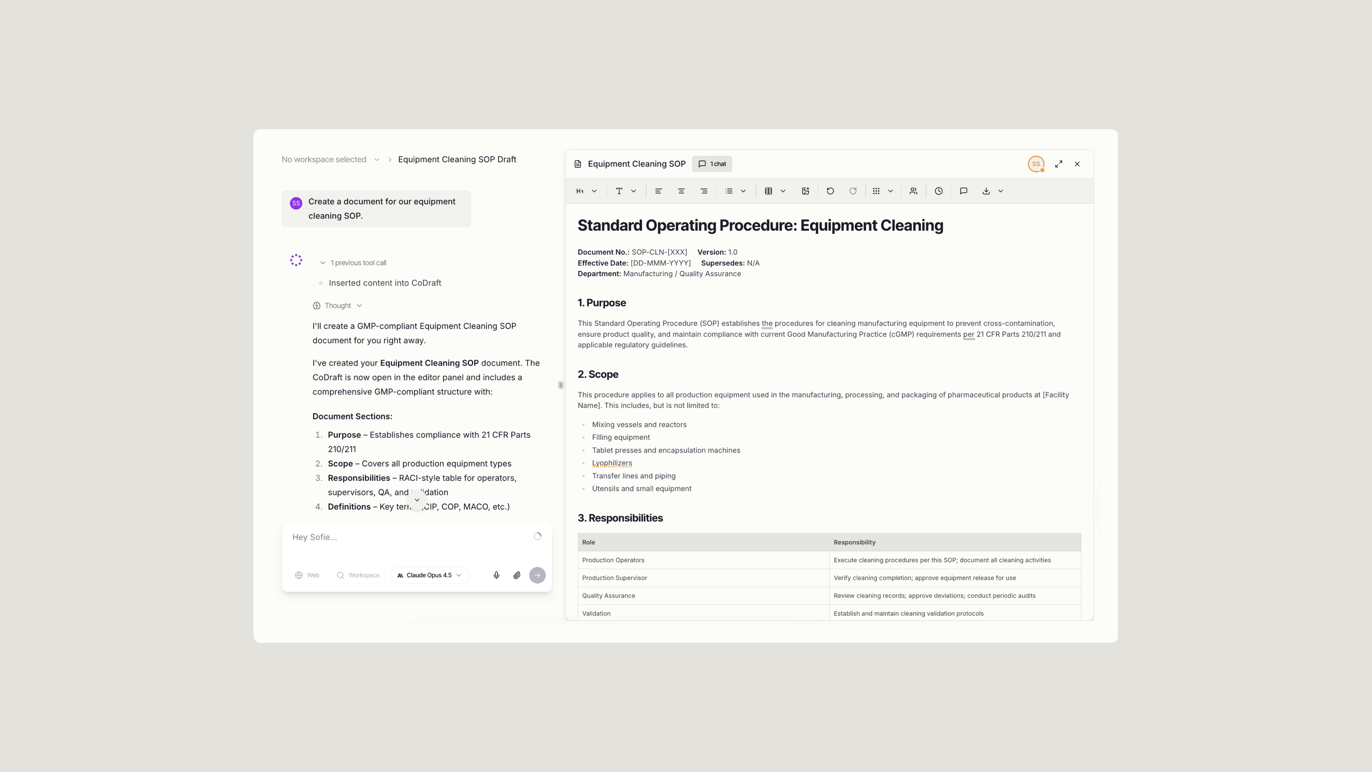 Sofie provides the perfect hub for drafting SOPs, protocols, and technical documents that adhere to regulatory and compliance standards. With a simple prompt, Sofie generates a fully fleshed out document in CoDraft where you can collaborate with your team in real-time. Starting from your ideas, CoDraft helps you build polished, compliant content together—eliminating writer's block and endless review cycles.