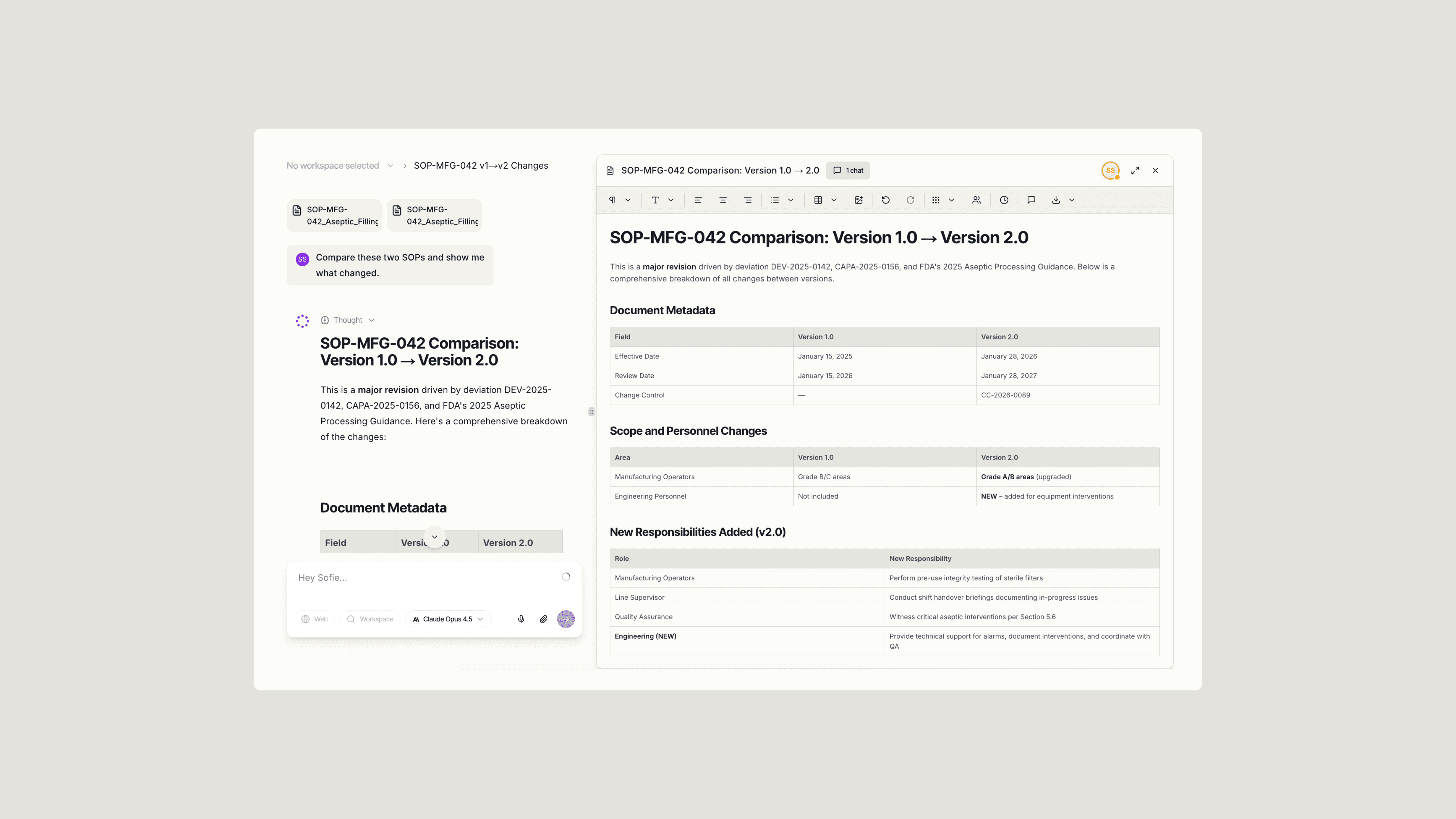 Sofie allows you to compare SOPs, batch records, or specifications by uploading multiple files to your chat. Get instant comparative analysis identifying what changed, what's missing, and what needs attention—turning hours of line-by-line review into minutes. This improves version control accuracy, change management efficiency, and compliance throughout your project. In this example, two files are attached to analyze differences between document versions, enabling Sofie to flag critical updates and highlight areas requiring review."