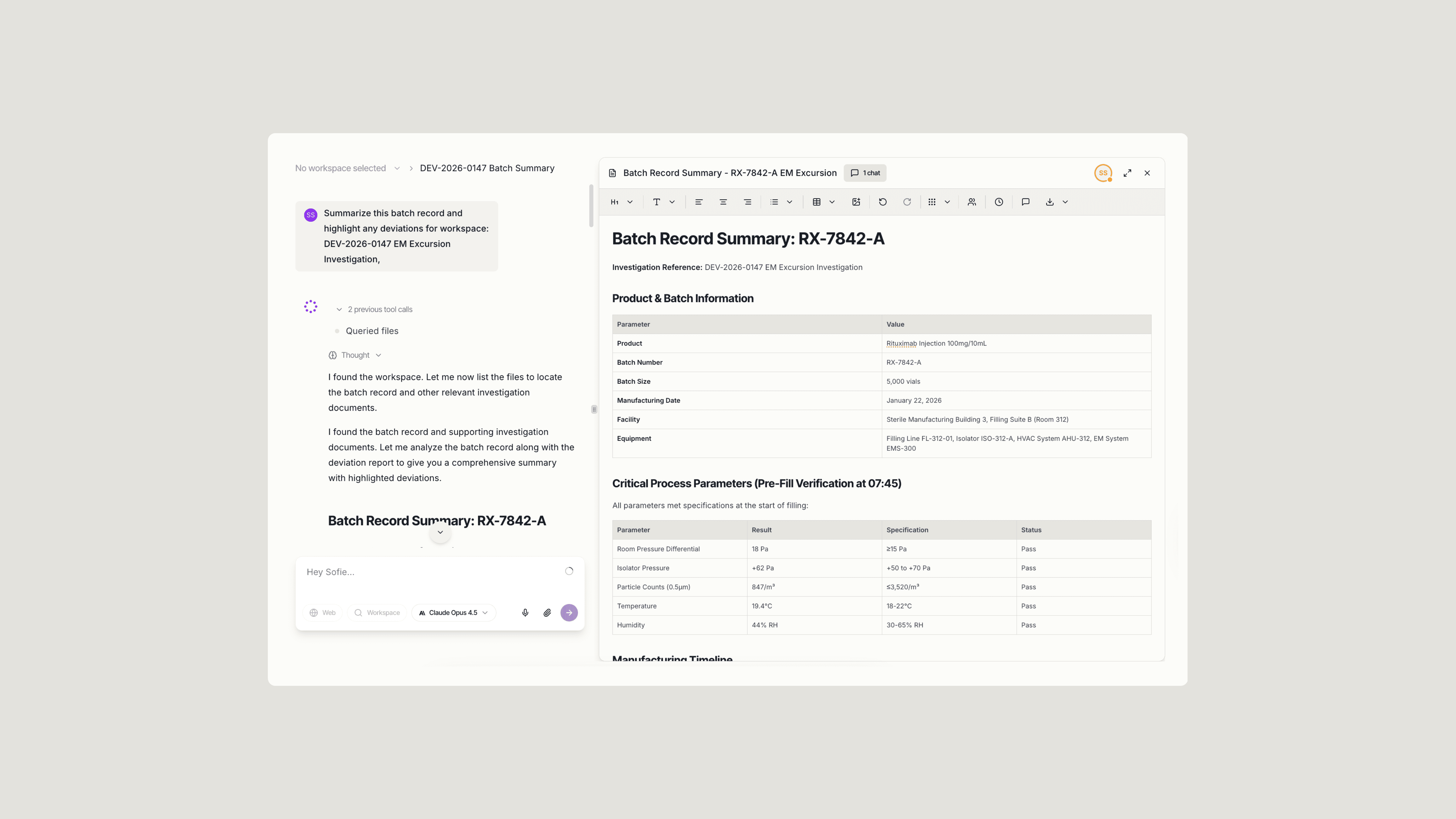 Sofie allows you to review batch records, analytical reports, or regulatory submissions in seconds by simply attaching files to your chat. Get instant summaries, risk assessments, or answers to specific questions—saving hours of careful reading. Whether it's a 200-page validation report or a complex dataset, Sofie improves decision-making speed, precision, and time management throughout your project.