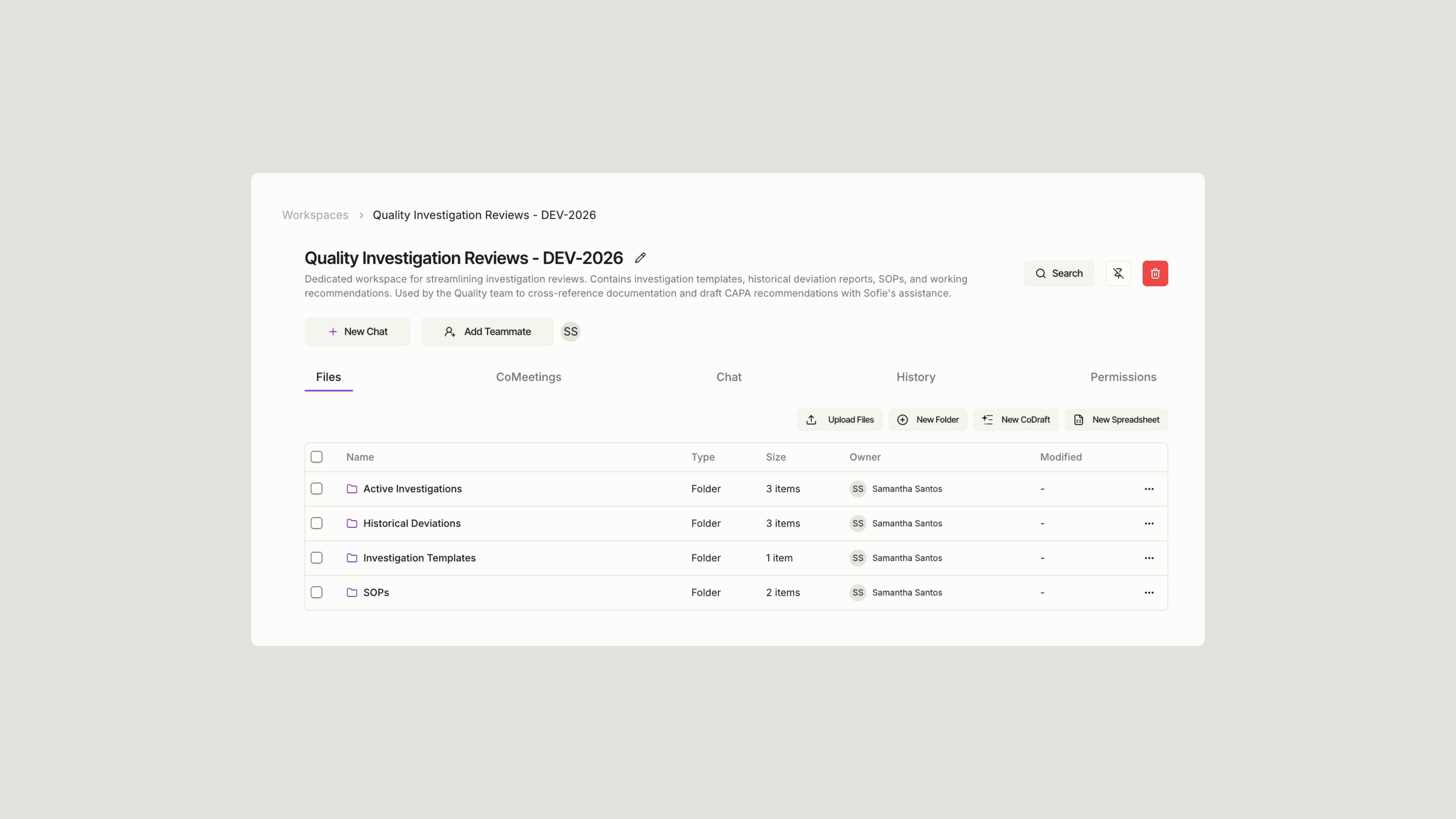 For example, a quality team at one of our pilot clients needed to streamline investigation reviews—a process that previously required manually cross-referencing deviation reports, SOPs, and historical investigations to draft recommendations. They created a dedicated workspace, uploaded their investigation templates, historical deviation reports, and relevant SOPs, and started asking Sofie to help.