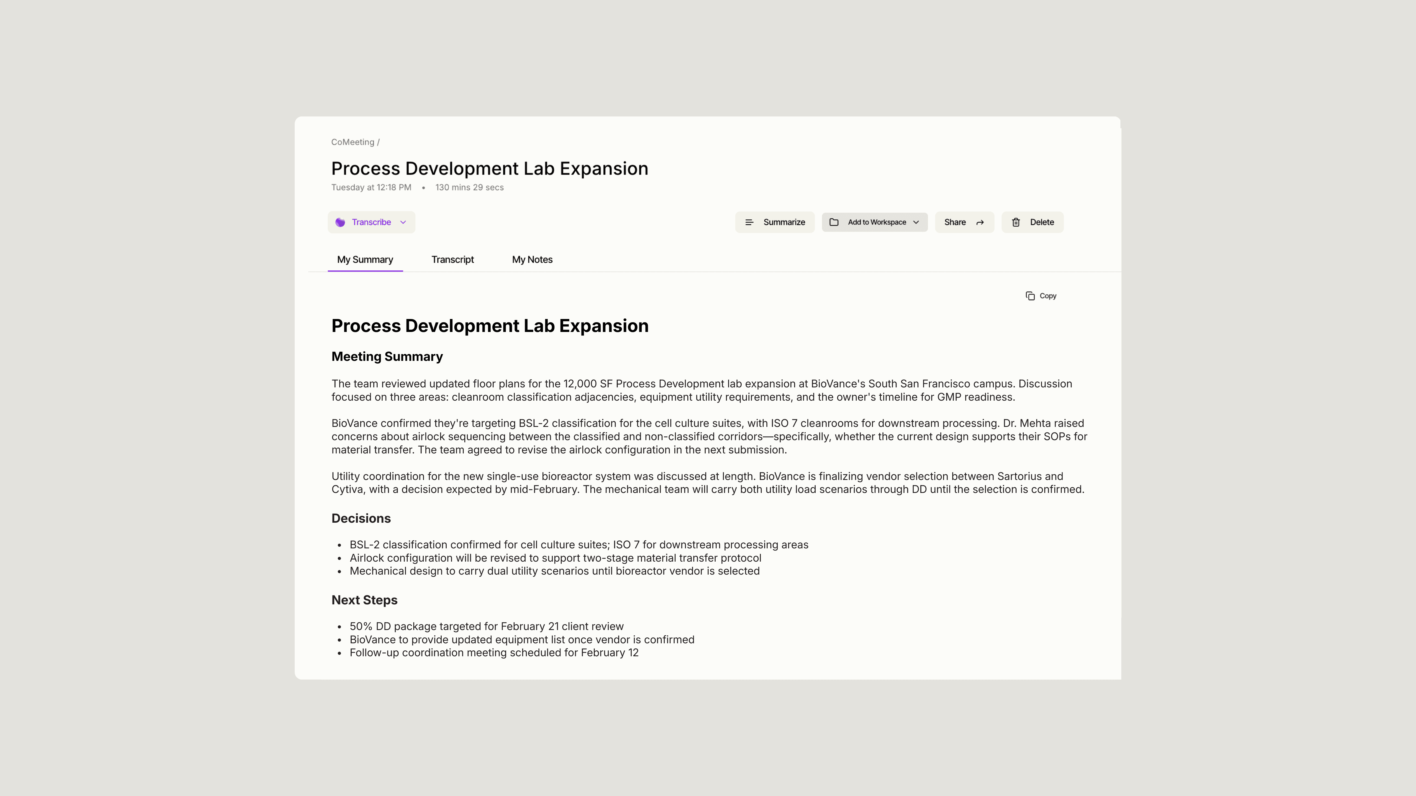 CoMeetings make it easier to capture conversations and transform them into actionable, searchable knowledge. Sofie joins your call, captures the full transcript, and generates a structured summary—surfacing key decisions and action items so you can stay focused on the discussion itself.