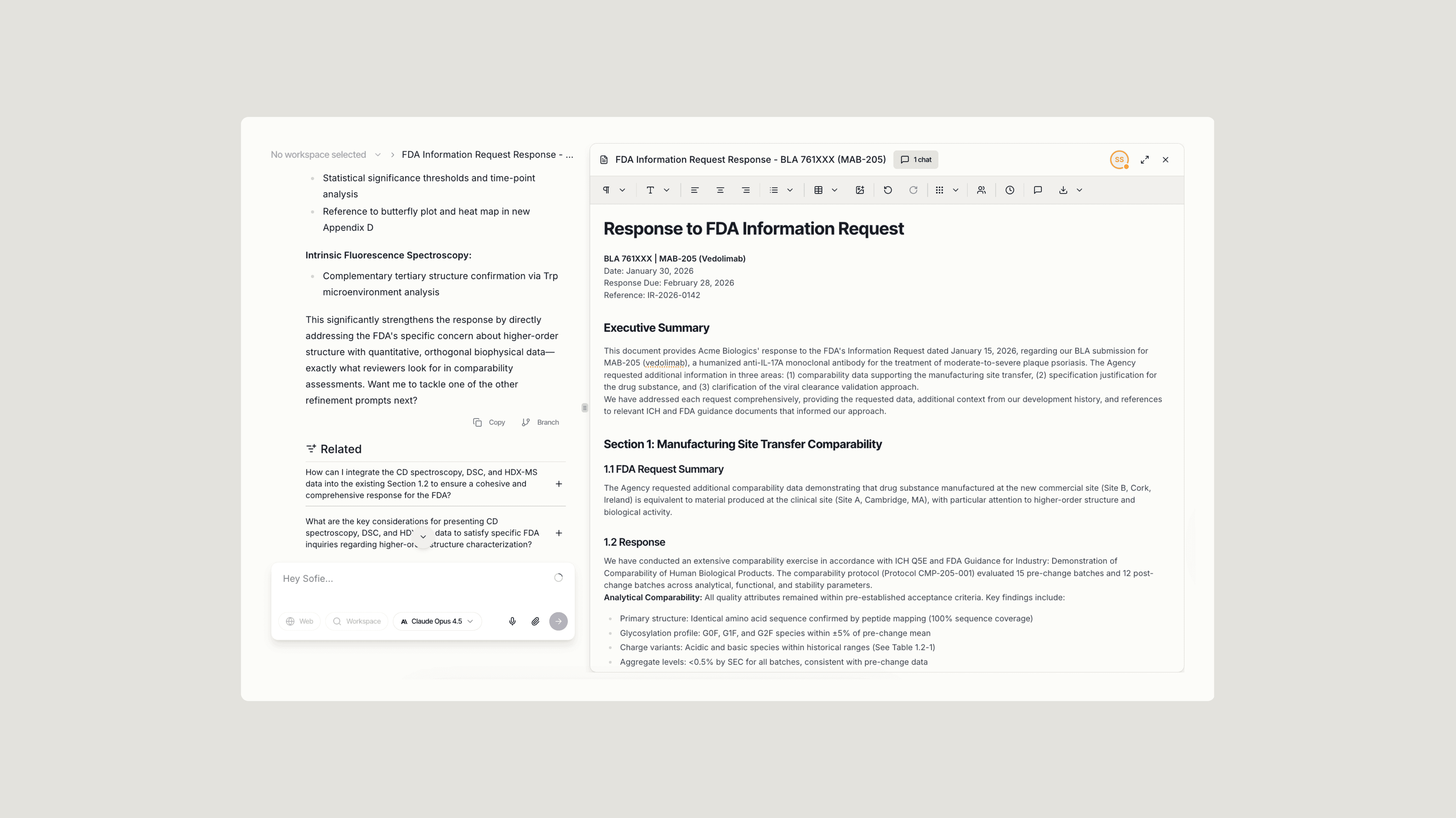 Here's how one regulatory affairs team uses it: When preparing a response to an FDA information request, they open a CoDraft and provide Sofie with the relevant guidance documents and their previous submissions. Sofie generates an initial draft, and then the team refines it collaboratively—highlighting specific sections for revision, asking Sofie to expand on technical details, or requesting alternative language for sensitive topics.