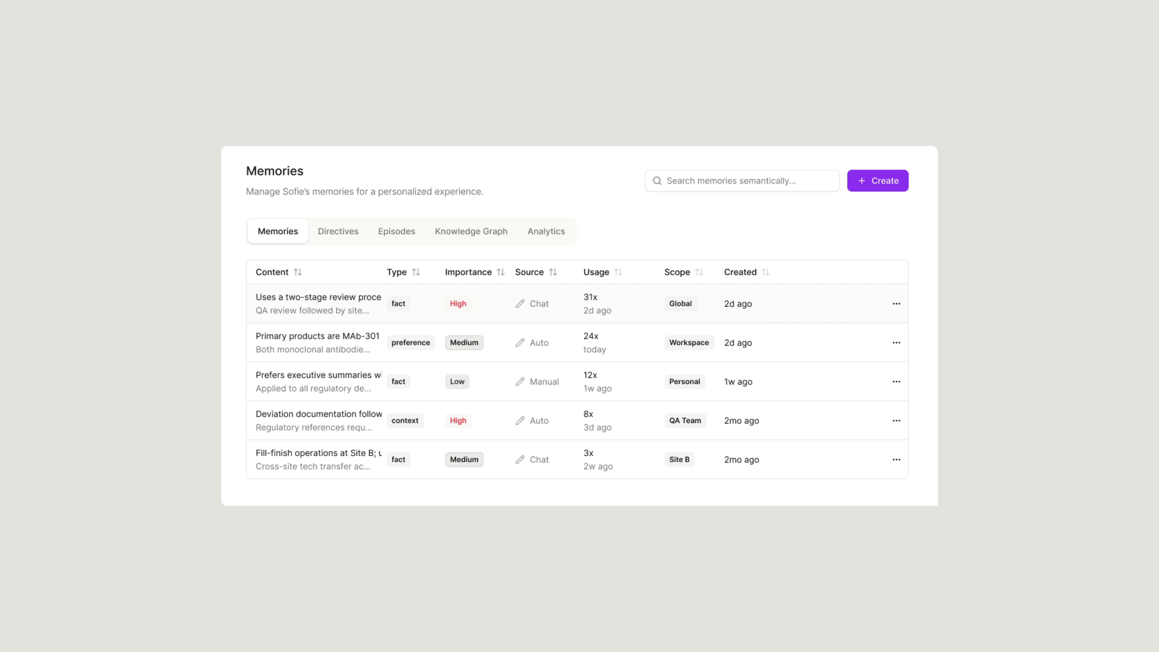 Memories capture facts, context, and preferences over time. As you work with Sofie it learns the details that shape how you work from your team structure and product modalities to site-specific SOPs and formats that work for your organization. These aren't stored passively — Sofie uses a hybrid retrieval system that combines semantic search, entity matching, importance weighting, and temporal awareness to surface the right context at the right moment.