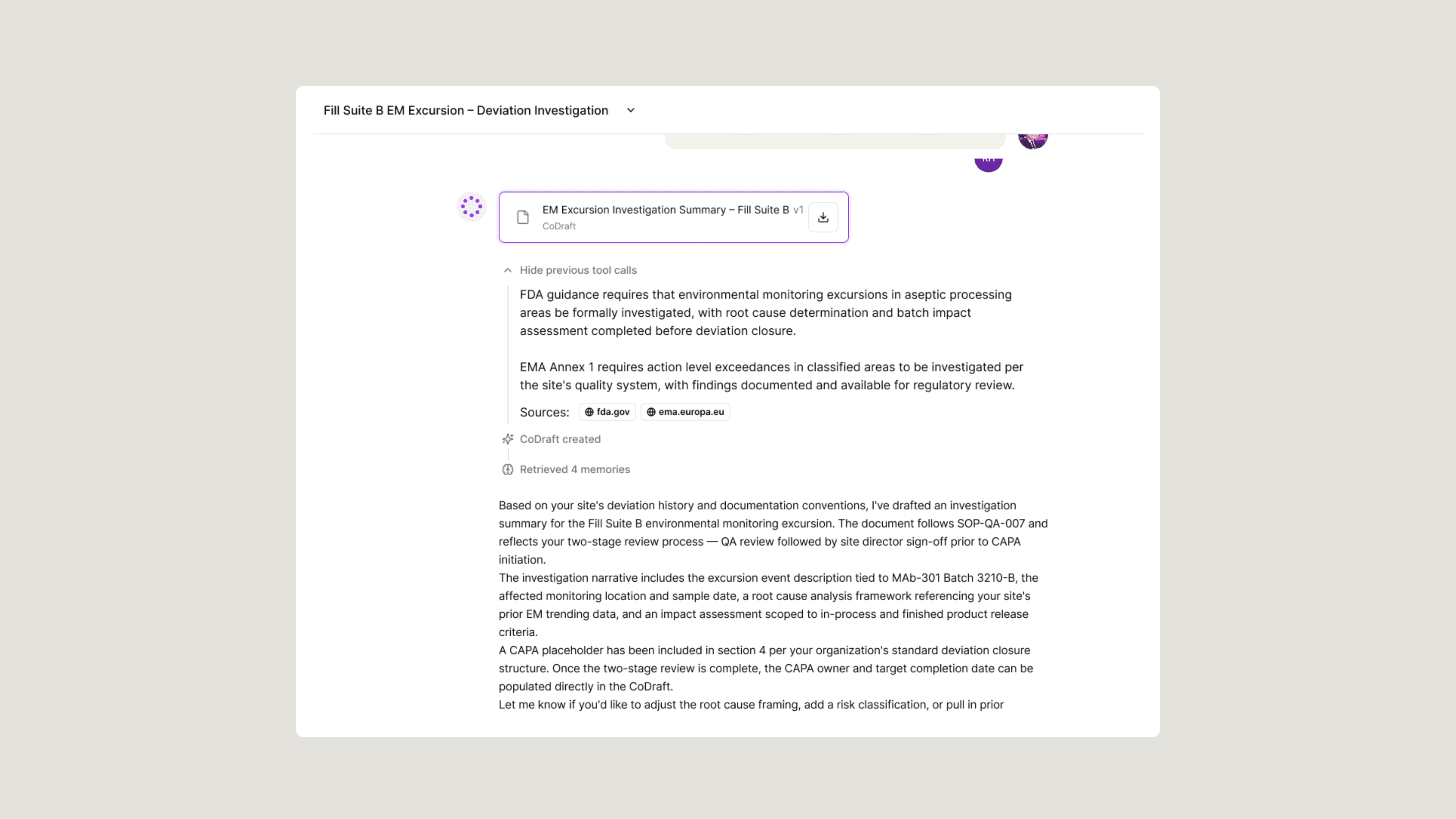 A QA lead reviewing environmental monitoring excursions gets outputs grounded in your site's deviation history, monitoring thresholds, and quality documentation conventions