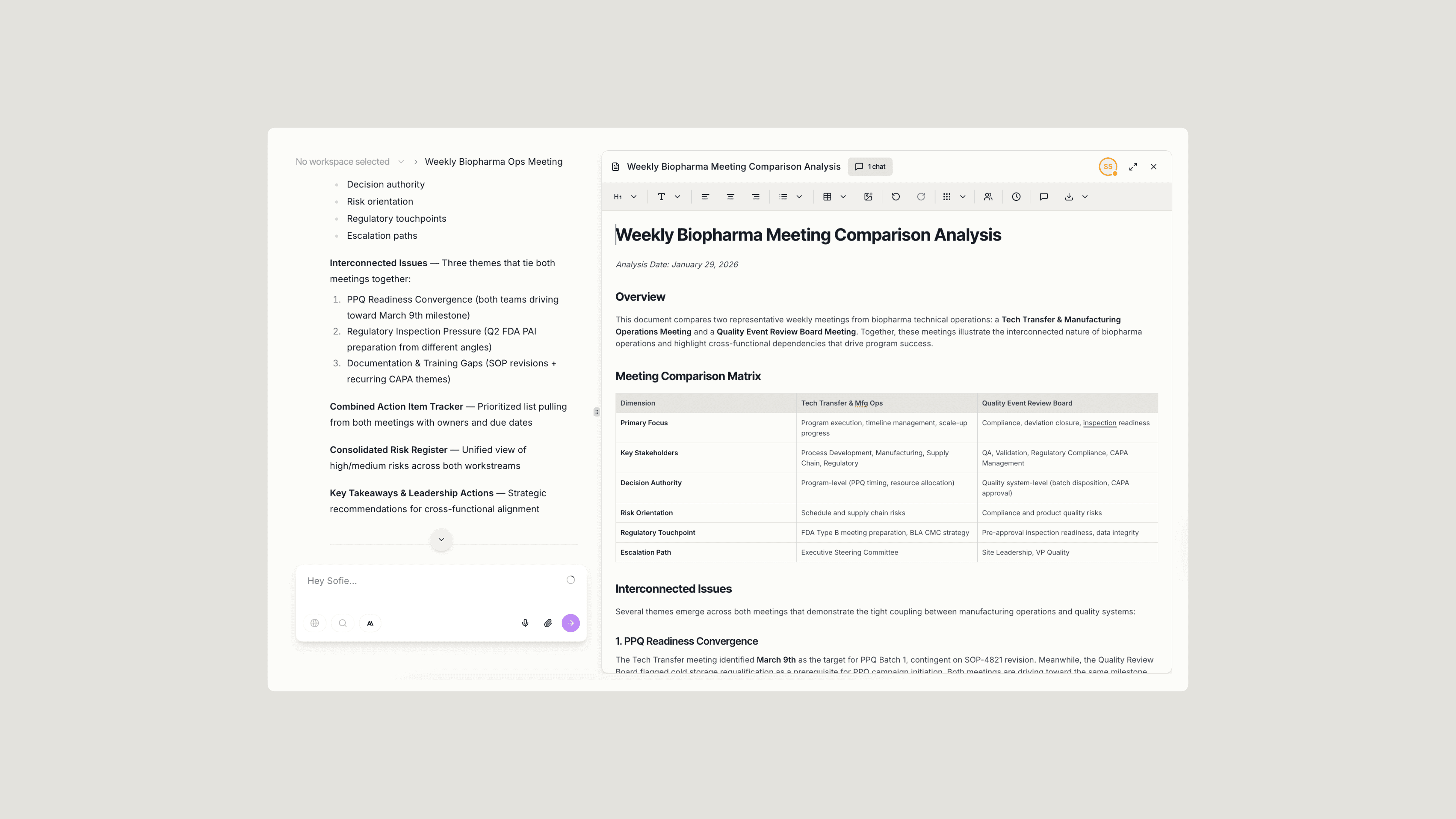 Sofie connects meeting insights from CoMeeting with workspace documents, regulatory requirements, and your complete chat history—creating comprehensive project intelligence that combines team discussions with documentation. When you ask about filtration concerns, you get the meeting decisions, equipment specs from your files, batch records showing impact, and that solution your team discussed three weeks ago. Sofie references meeting decisions when analyzing workspace documents and pulls relevant project documentation when reviewing meeting insights—so everything works together to turn fragmented information into complete answers that accelerate decisions.