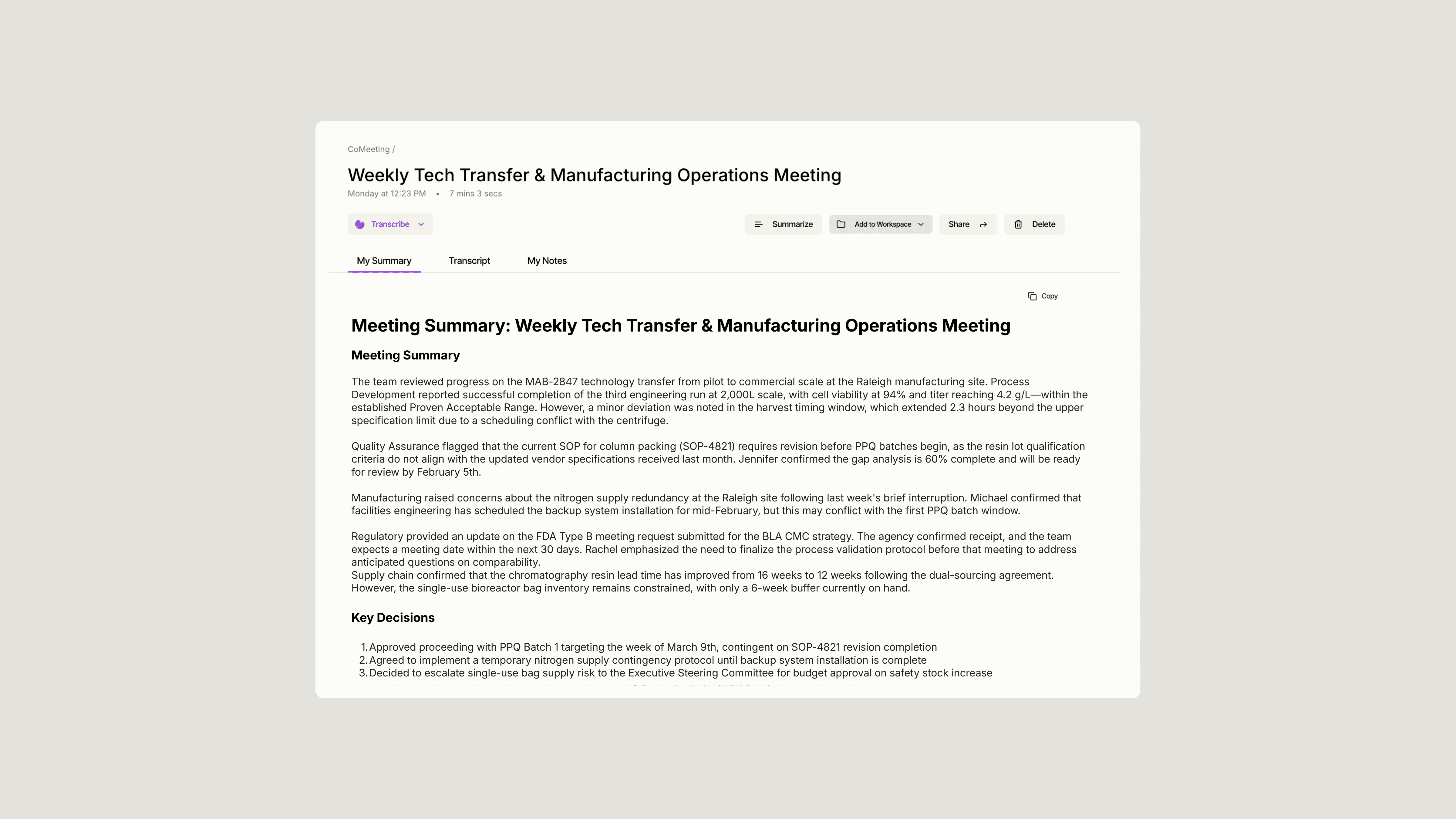 Critical decisions happen every day—whether it's manufacturing reviews, regulatory discussions, or project reviews, most biopharma conversations happen in meetings (virtual or in-person).