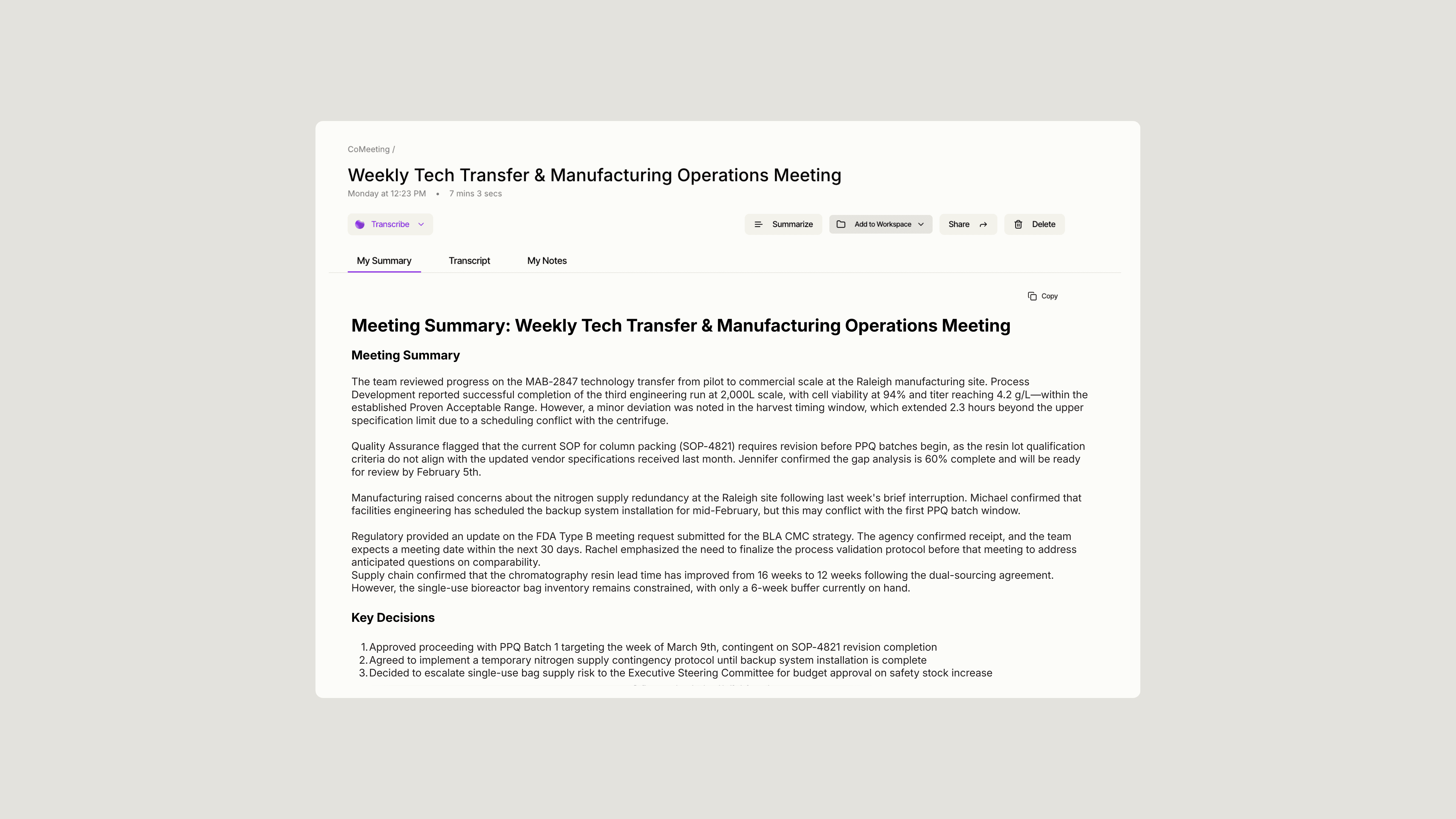 Let’s see how this works in a real biopharma scenario. Consider a tech transfer project spanning multiple months with weekly progress meetings, regulatory discussions, and technical reviews. Here, it’s inevitable that details get lost and Sofie gives you the perfect launch pad for organizing, reviewing, and revisiting any meeting detail. CoMeeting becomes your knowledge base, saving your time and allowing Sofie to gather the context you need for any project update, question, or transfer.