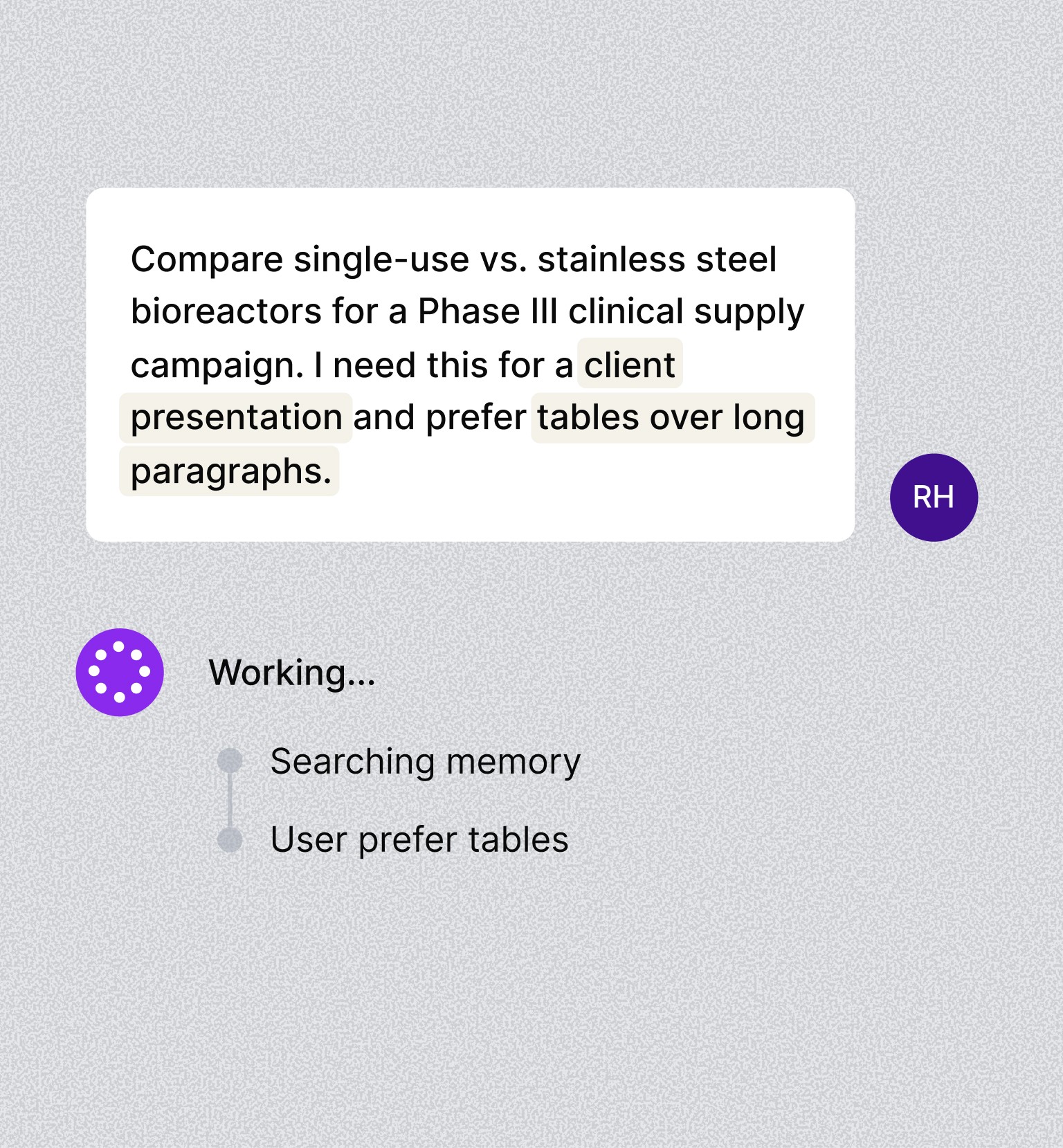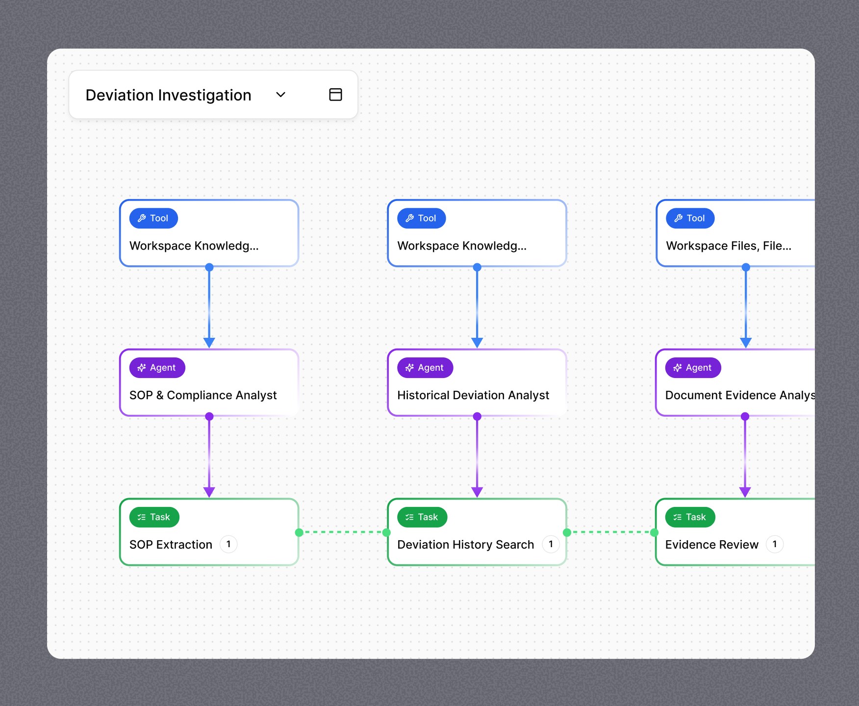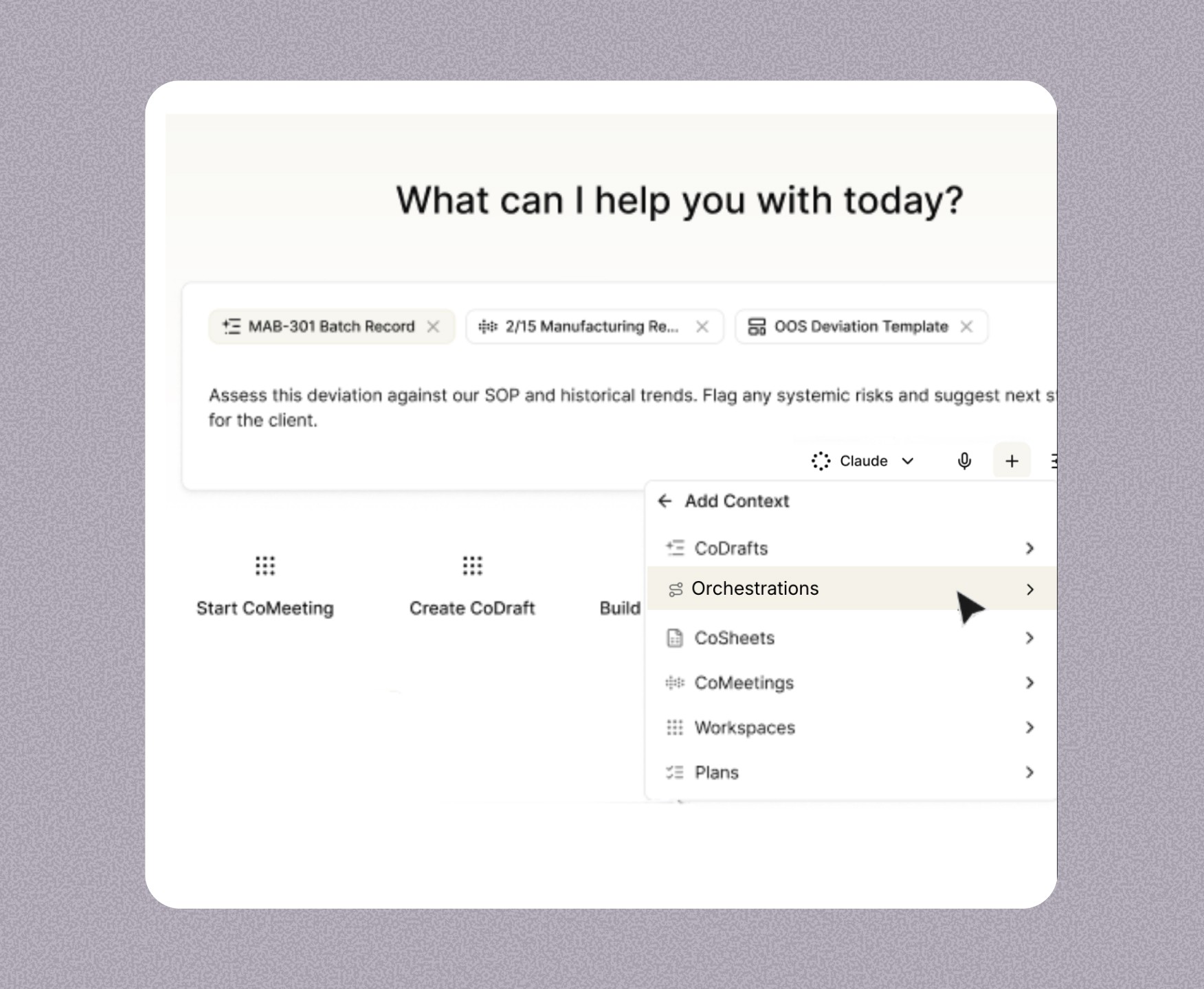 Built on a proprietary agentic framework designed for biopharma, orchestrations automate any workflow — from GxP-critical processes to cross-functional operations beyond. Start from a library of prebuilt, biopharma-specific orchestrations or build your own, even by describing what you need out loud with voice mode. Run them whenever you want, you define the scope and checkpoints, the agents handle the rest.